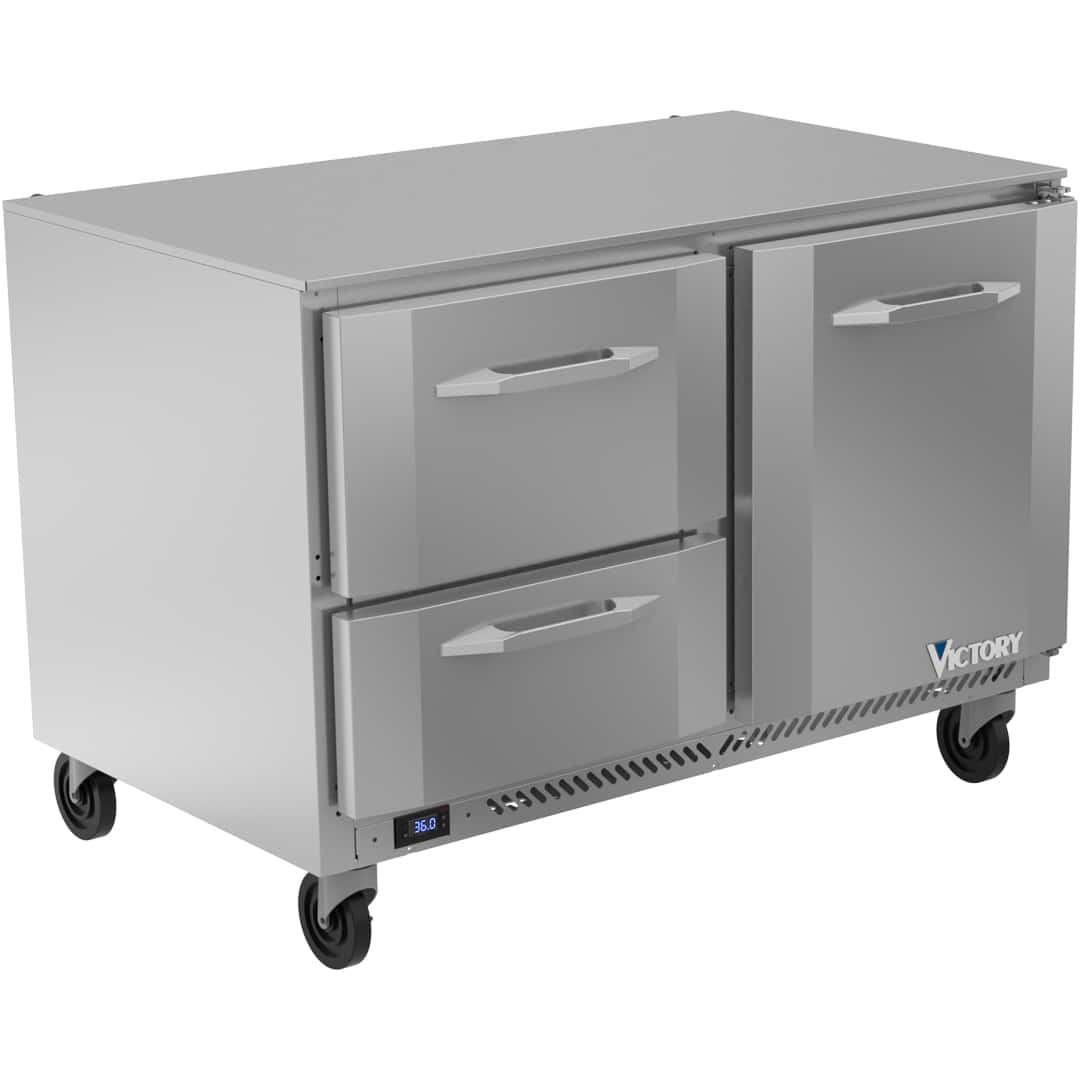 Grab fresh ingredients or chilled merchandise in an instant with this space and energy-saving Victory Refrigeration VURD48HC-2 double-section Undercounter Refrigerator Enjoy 13.9 cubic feet storage capacity that offers multiple storage options to suit various needs. One section is a cabinet with two epoxy-coated shelves while the second section with a top and bottom drawer complete with pan supports for organizing ingredients into pans up to 6″ deep.