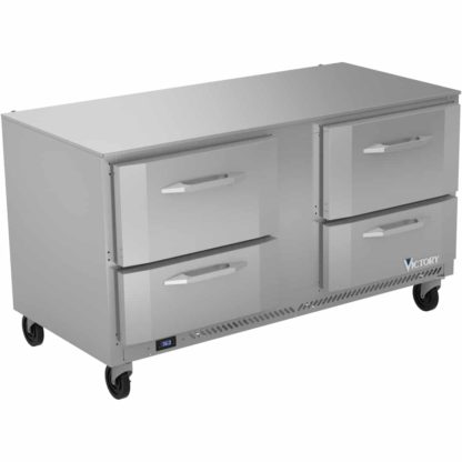 The 60″ wide Victory Refrigeration VURD60HC-4 Undercounter Refrigerator with 17.1 cubic feet storage capacity offers quick access to pans of fresh ingredients. This unit has a total of four 20-gauge stainless steel drawers with solid pan glides that can fit pans up to 6″ deep. Each drawer has telescoping slides with a locking mechanism designed to slide and reveal the contents for easy access. They are all self-closing to ensure proper closure after every access. They also have a stay-open feature that facilitates ergonomic product loading.