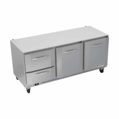 The 72″ wide Victory Refrigeration VURD72HC-2 Undercounter Refrigerator is perfect for both small and larger product needs with the 21.5 cubic feet storage capacity enclosed in stainless steel and galvanized steel exterior.