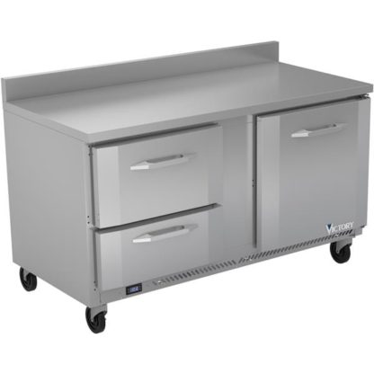 The Victory Refrigeration VWFD60HC-2 worktop freezer is approved for commercial use by UL-Sanitation, cULus, and UL EPH Classified certifications. It includes a three-year parts and labor warranty and a two-year gasket warranty. This model is used with a 115v, 60Hz, and single-phase power supply and is supplied with an 8′ cord and NEMA 5-15P plug. If you want to get the best out of your unit, check out our customization options below to find more parts and accessories available for this unit.