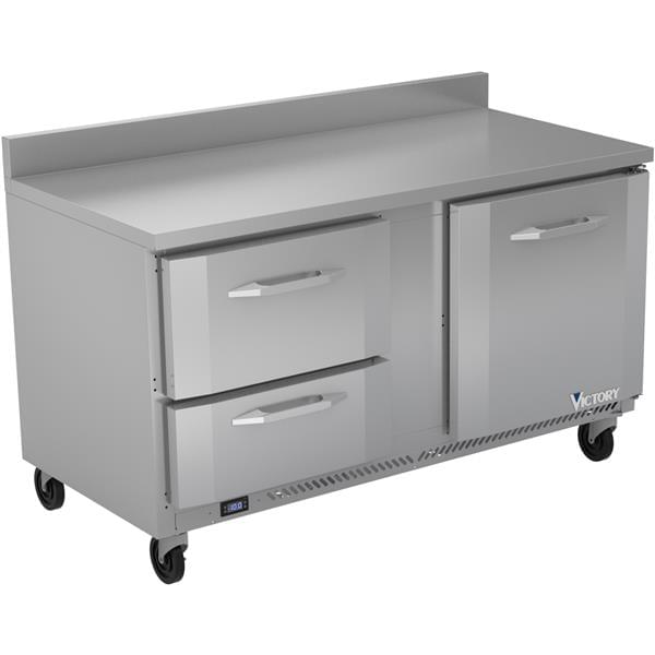 A food prep surface at the top and refrigerated base at the bottom, the Victory Refrigeration VWFD60HC-2 worktop freezer is a convenient solution for operators big and small looking to consolidate storage and food prep task. The base is a spacious 14.36 cubic feet freezer. This unit is robustly constructed as well with the rust-proof, easy-to-clean stainless steel front, top, and sides, and corrosion-resistant aluminum interior. The evaporator coil has epoxy coating that helps extends its life.