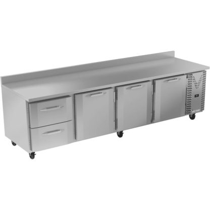 The 118.88″ wide Victory Refrigeration VWRD119HC-2 Commercial Worktop Refrigerator is a true workhorse in the kitchen with a spacious stainless steel top and a massive 40.12 cubic feet refrigerated space split into four storage sections. Carefully constructed to weather the rigors of a busy kitchen, this USA-made unit has a stainless steel top, sides, and front impervious to rust or chipping as well as solid galvanized steel back and bottom. The inside is made of aluminum while the evaporator coil is epoxy-coated to help prolong its usable life.