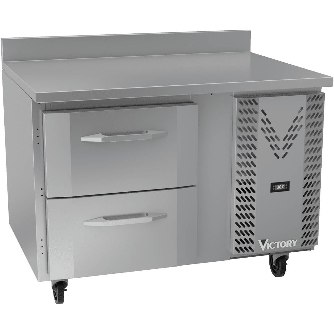 Save time and be more productive by adding this Victory Refrigeration VWRD46HC-2 Commercial Worktop Refrigerator to your busy kitchen. The stainless steel top gives you added counter space that will serve you well during food prep. The base offers 10.8 cubic feet storage space split into two drawer sections perfect for chilling ingredients organized in 4″ or 6″ deep pans.