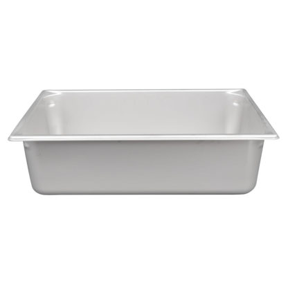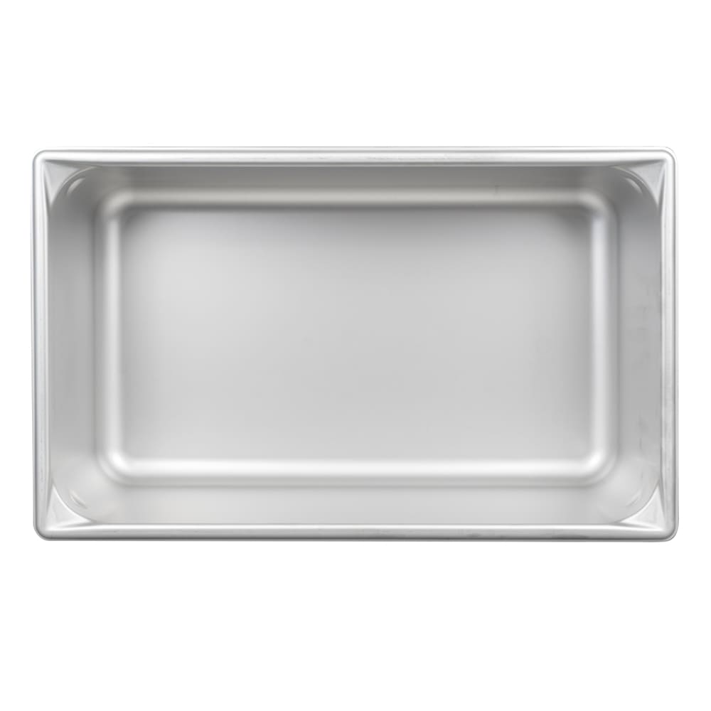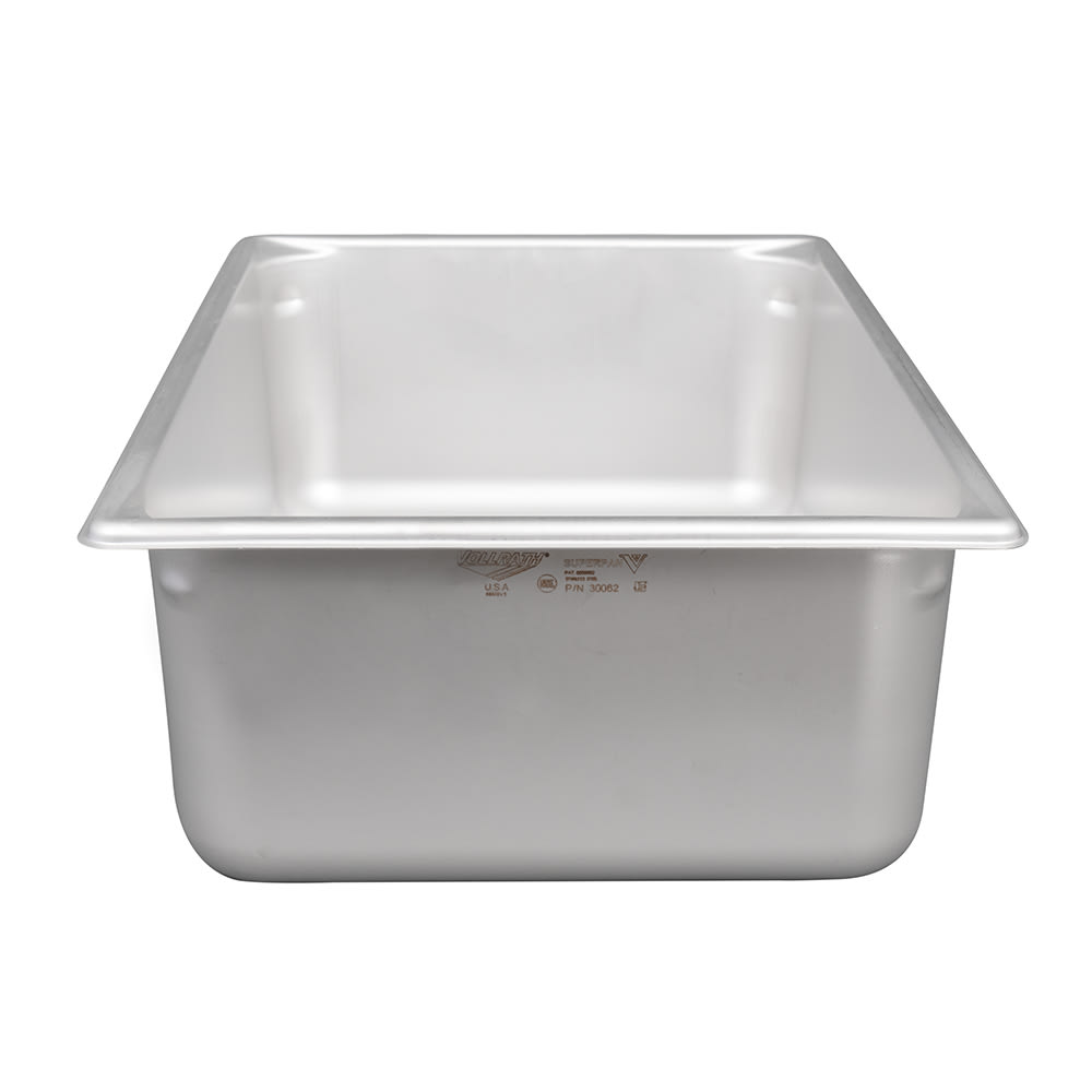 The Vollrath 30062 Super Pan V full-size hotel pan has a 6-inch depth and accommodates 21 quarts to the rim. Constructed of durable stainless steel, it can withstand heavy use and is easy to clean. The user can easily pour the contents out of it since the corners are strong and specially designed to evacuate product. The bright finish and smooth curves on this Vollrath 30062 Super Pan V full-size food pan provide a professional look. The curves also prevent food from getting trapped inside the pan.