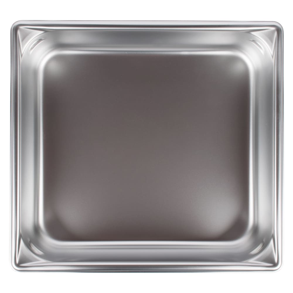 The Vollrath 30142 Super Pan V two-third-size pan holds 9.3 quarts of product. The stainless steel construction adds durability and rust resistance. When placed in a steam table, the pan enhances product presentation with smooth curves and a bright finish. Designed to save space, the pan is stackable and will not stick to other pans.