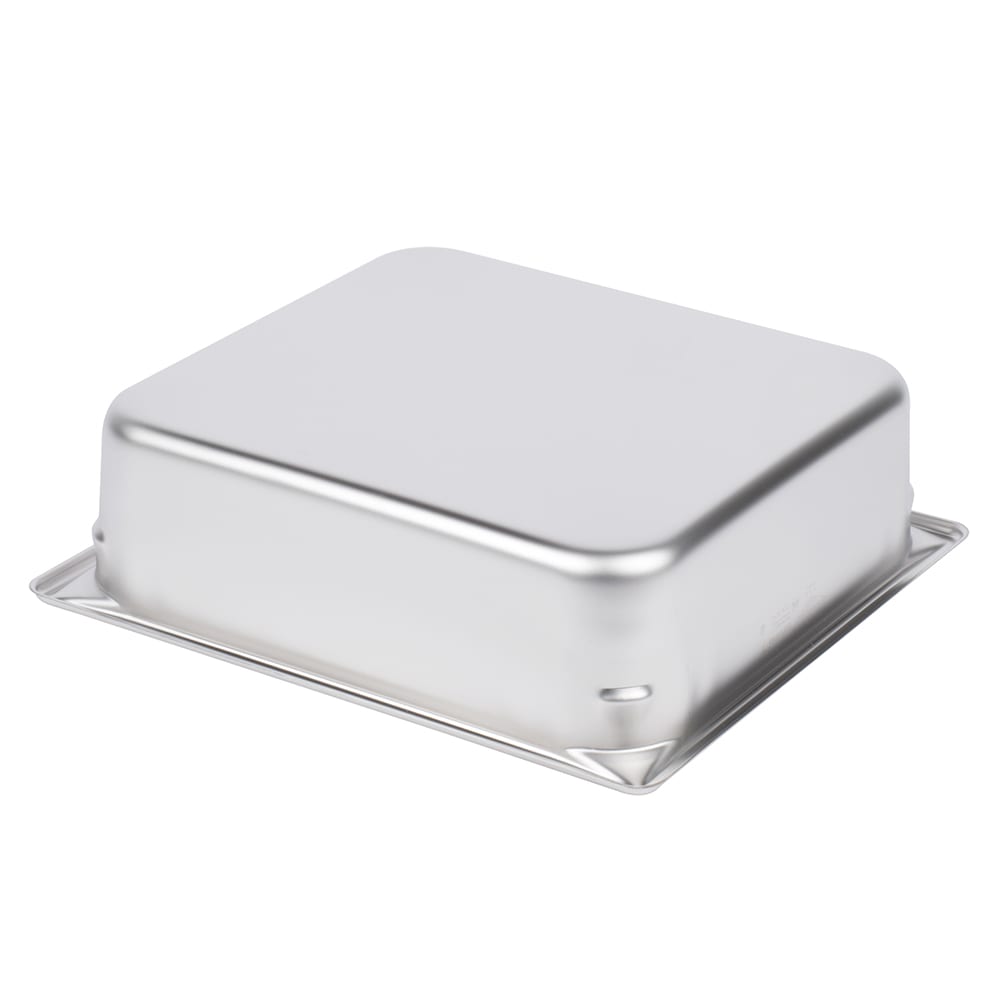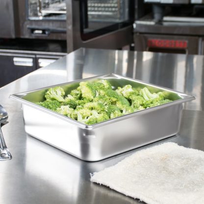 Super Pan V Food Pan, 2/3 size, 4″ deep, 9.3 qt capacity, 22 gauge, 300 series stainless steel, reinforced pour corners, reverse formed flattened edges, anti-jamming design, NSF, Made in USA, Jacob’s Pride Collection