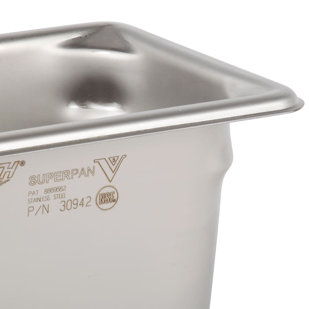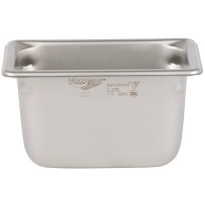 Holding 1.1 quarts of product, the Vollrath 30942 Super Pan V ninth-size hotel pan has a 4-inch depth. Reinforced corners on the dish make it easy to pour contents out without causing damage. It is constructed of stainless steel, which is heavy duty and resistant to corrosion. With its bright finish, the pan creates a clean feel. The Vollrath 30942 Super Pan V ninth-size food pan has smooth curves that makes cleaning the interior simple.
