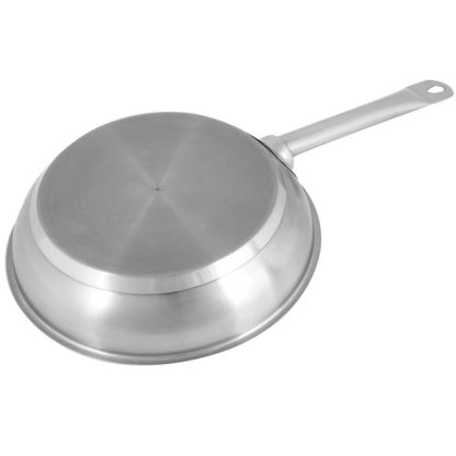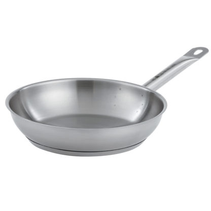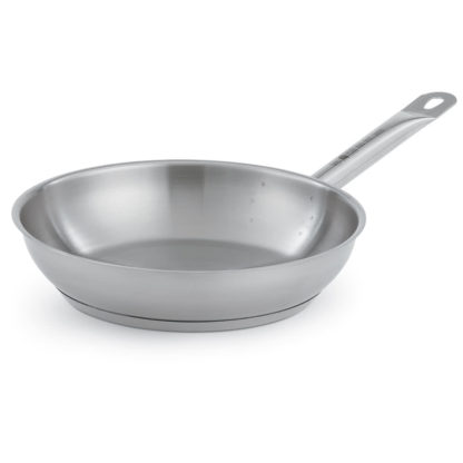 Made to brown, sear, fry, saute, and more, the Vollrath 3809 Optio stainless steel frying pan has a versatile construction and 91/2-inch diameter. Because the pan is made of stainless steel, it won’t discolor and transfer flavors, and it’s resistant to corrosion and dents. Stainless steel is made with iron-a material necessary for cookware to be used with induction. The bottom of the pan is aluminum clad, improving heat distribution consistency.