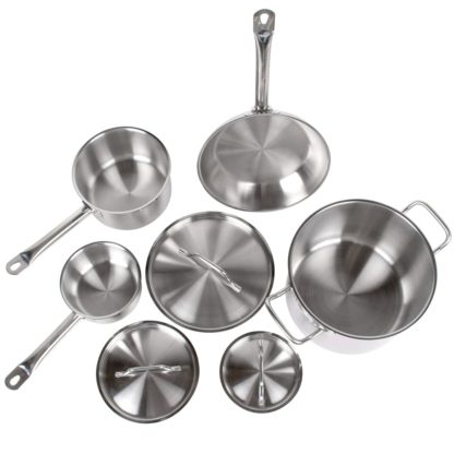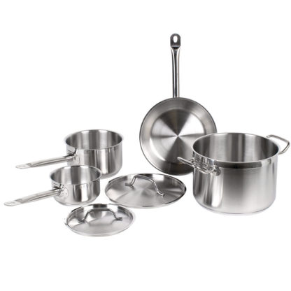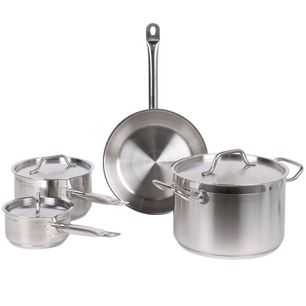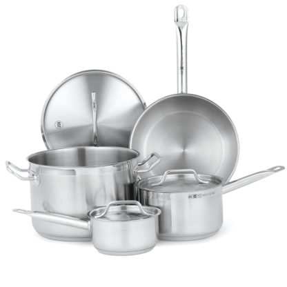 The Vollrath 3822 Optio Deluxe cookware set includes myriad pans that can be used to boil, braise, sautee, fry, and steam. Matching lids can be placed on the pans to trap steam and heat-speeding cook times and reducing dryness-and removed to vent excess moisture, avoiding sogginess. Sturdy, rounded handles on the pans resist heat transfer, and the pans are compatible with induction-style cooktops.