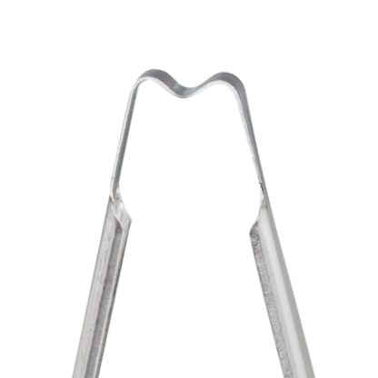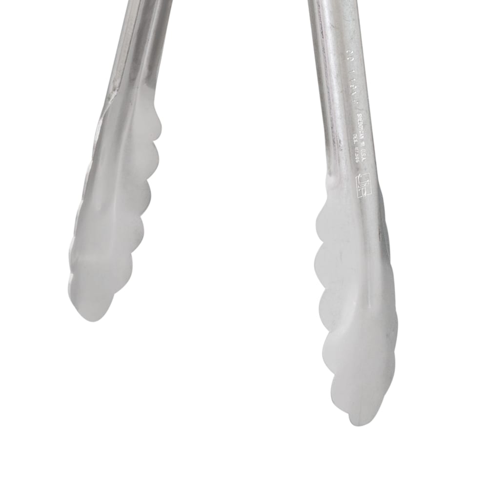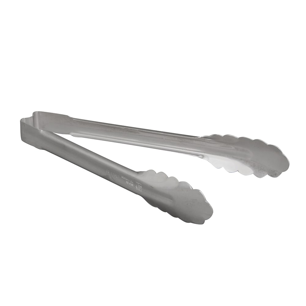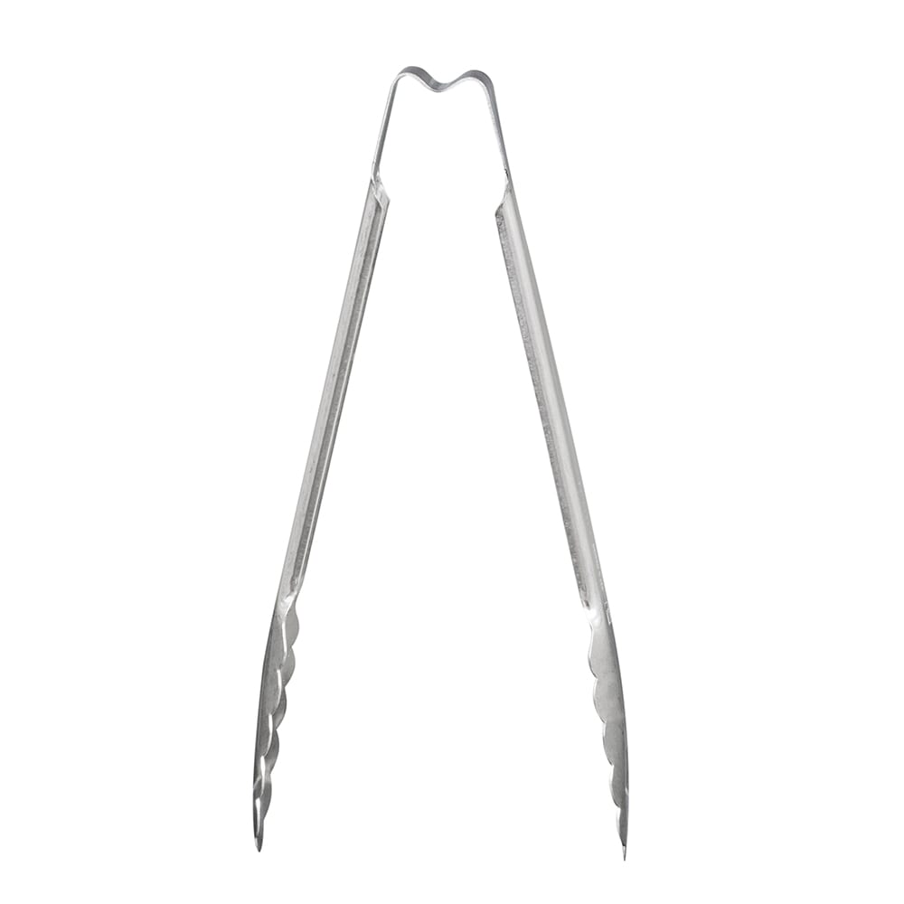 The Vollrath 4780910 utility tongs have concaved ends and scalloped teeth, efficiently grabbing product in prep or service areas and on buffet lines. The stainless steel construction provides strength and rust resistance, while the springless design facilitates cleaning by eliminating crevices. The handle on this utensil is designed to promote user comfort.