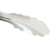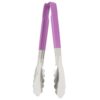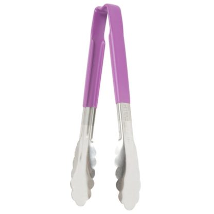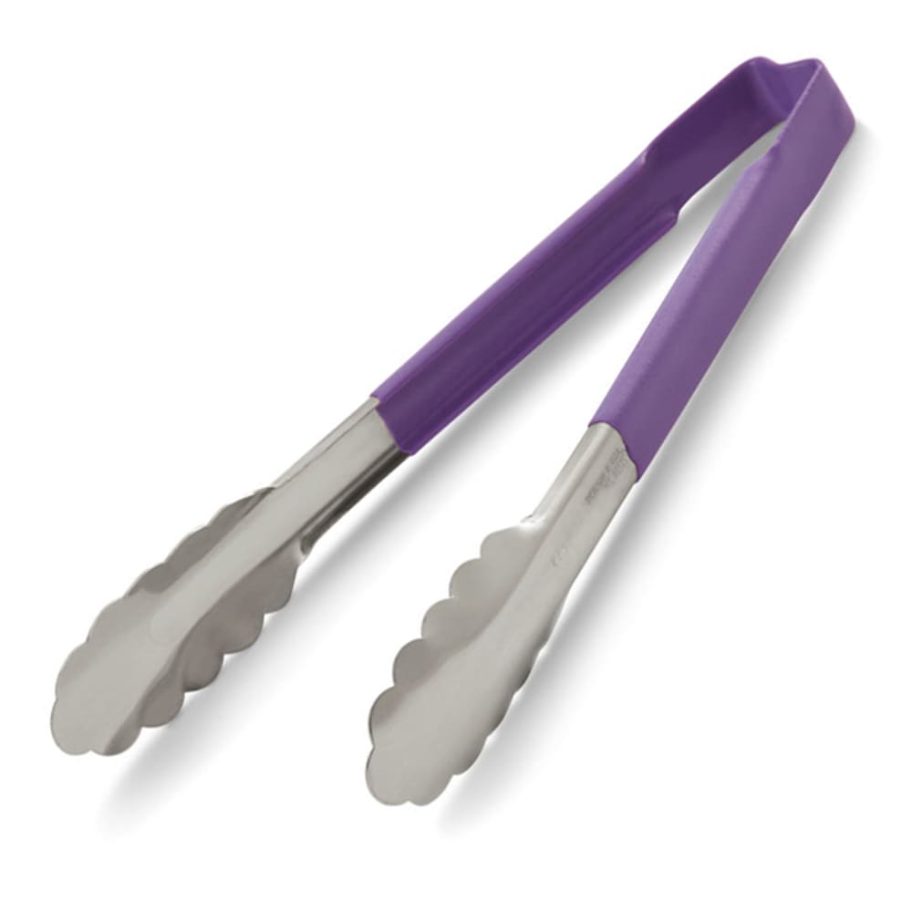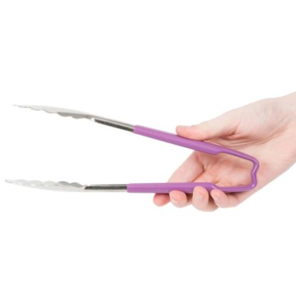 The Vollrath 4780980 tongs have a purple plastic handle, making it ideal for use in allergen areas in a color-coded system. The ends of the tongs are concave and have scalloped edges to easily pick up food. Made of stainless steel, the tongs resist stains and rust. They can be used in heat as high as 180 degrees Fahrenheit. Since the tongs have a springless design, they are easy to clean without cracks or crevices.