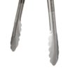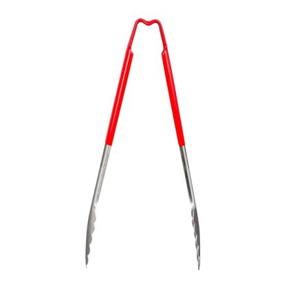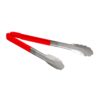 The Vollrath 4781240 utility tongs can be used in temperatures as hot as 180 degrees Fahrenheit. With the springless design, bacteria cannot harbor in small crevices. The scalloped edges, paired with concave ends, easily grab product. Since the red handle is plastic coated, it can be used in color coding and stays cool to the touch. Strength and durability are provided by the stainless steel construction.