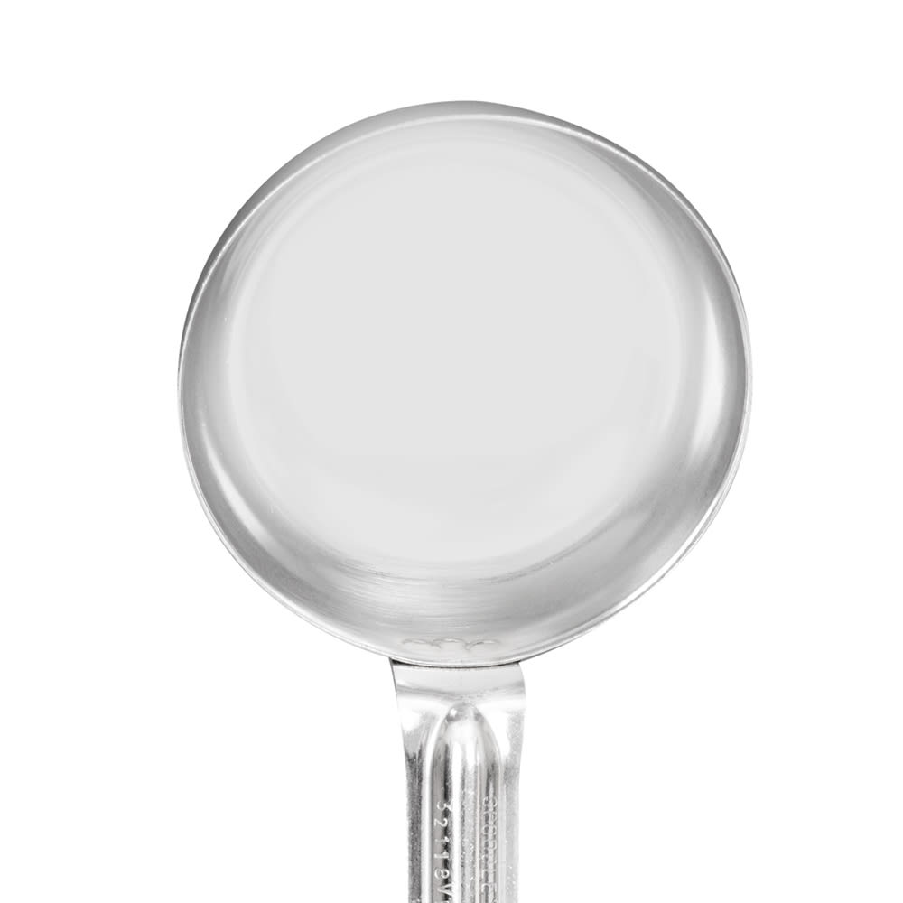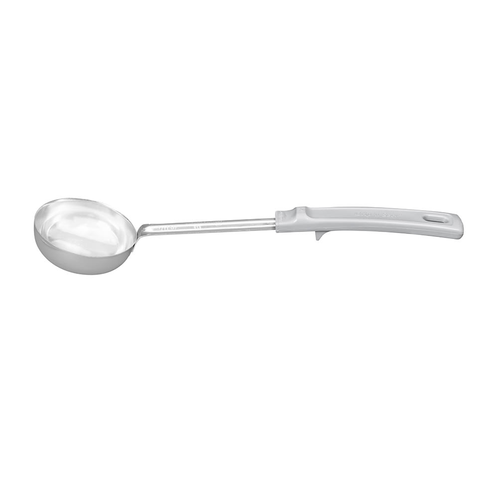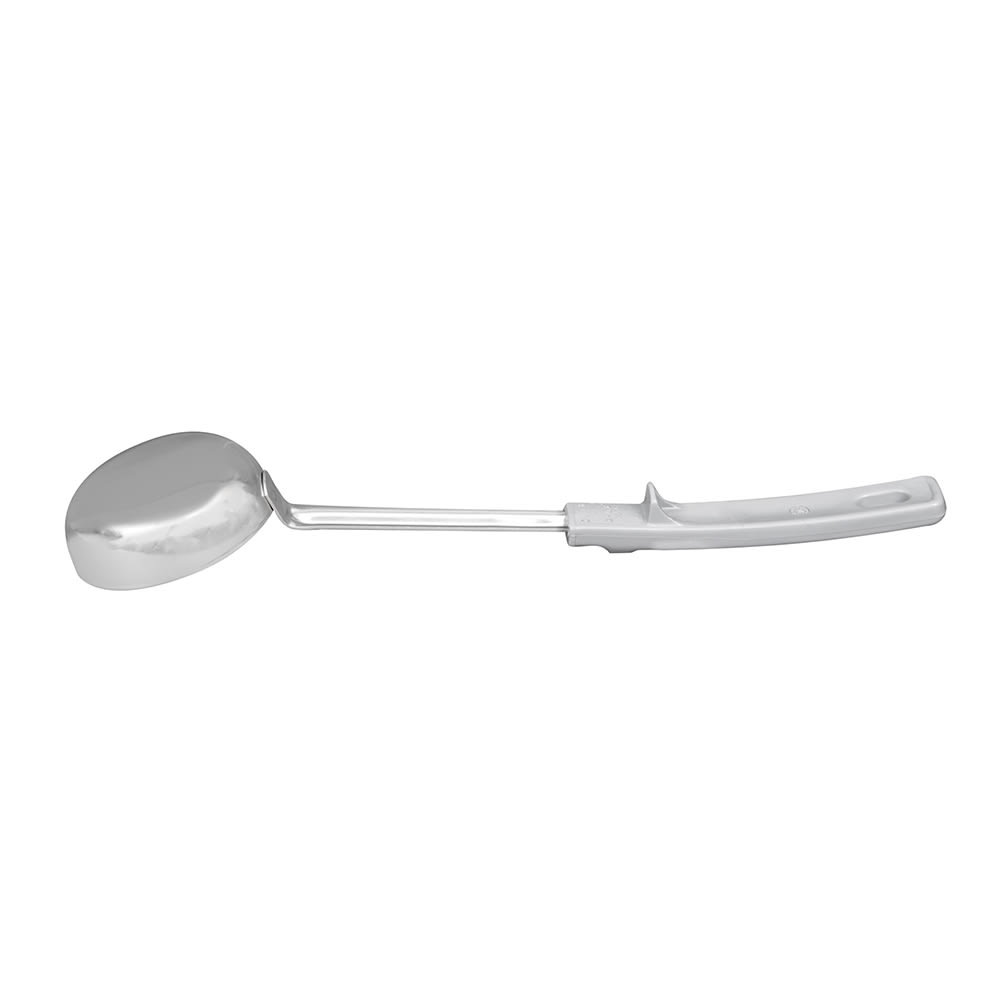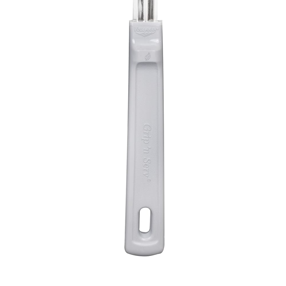 The gray handle of the Vollrath 62172 solid Spoodle lets employees see at a glance that it accommodates 4 ounces of product, and it also enables color coding when needed. To provide protection against germs, the handle is coated in antimicrobial, and its ability to withstands heat as high as 230 degrees Fahrenheit ensures it can be used in a hot pot. A stopper prevents it from sliding into the pot if an employee needs to step away to tend to other responsibilities. Providing corrosion resistance when used around water, the scoop is made of stainless steel.
