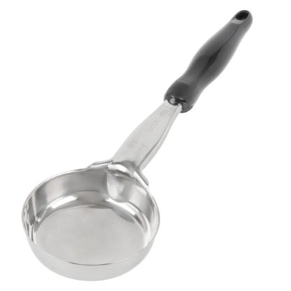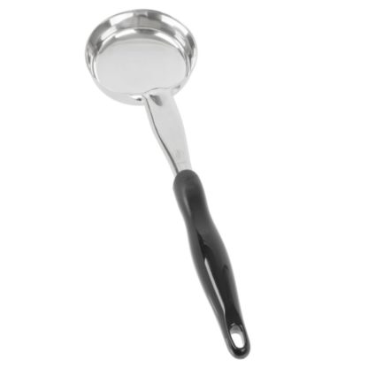Spoodle, 1-piece heavy duty, solid round bowl, handle coded black, equipped with all-natural antimicrobial, 6 oz. (177.4ML), 18/8 304 stainless steel, ergonomic design high temperature textured nylon handle heat resistant to 450°F (232°C), built-in stopper notch, capacity stamped on shaft, 13-3/4″ overall L, 3-11/16″bowl diameter, limited warranty, NSF, imported, Jacob’s Pride Collection, Limited Lifetime Warranty