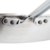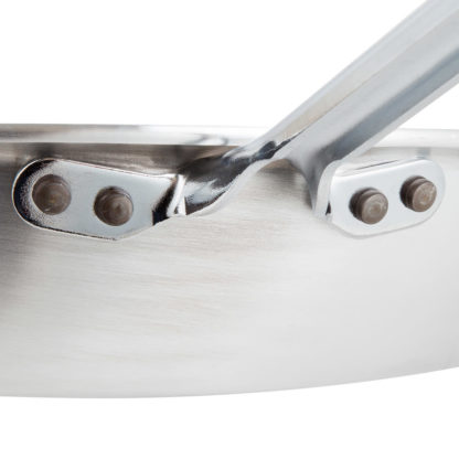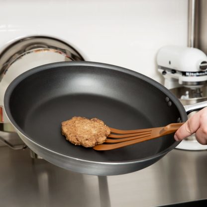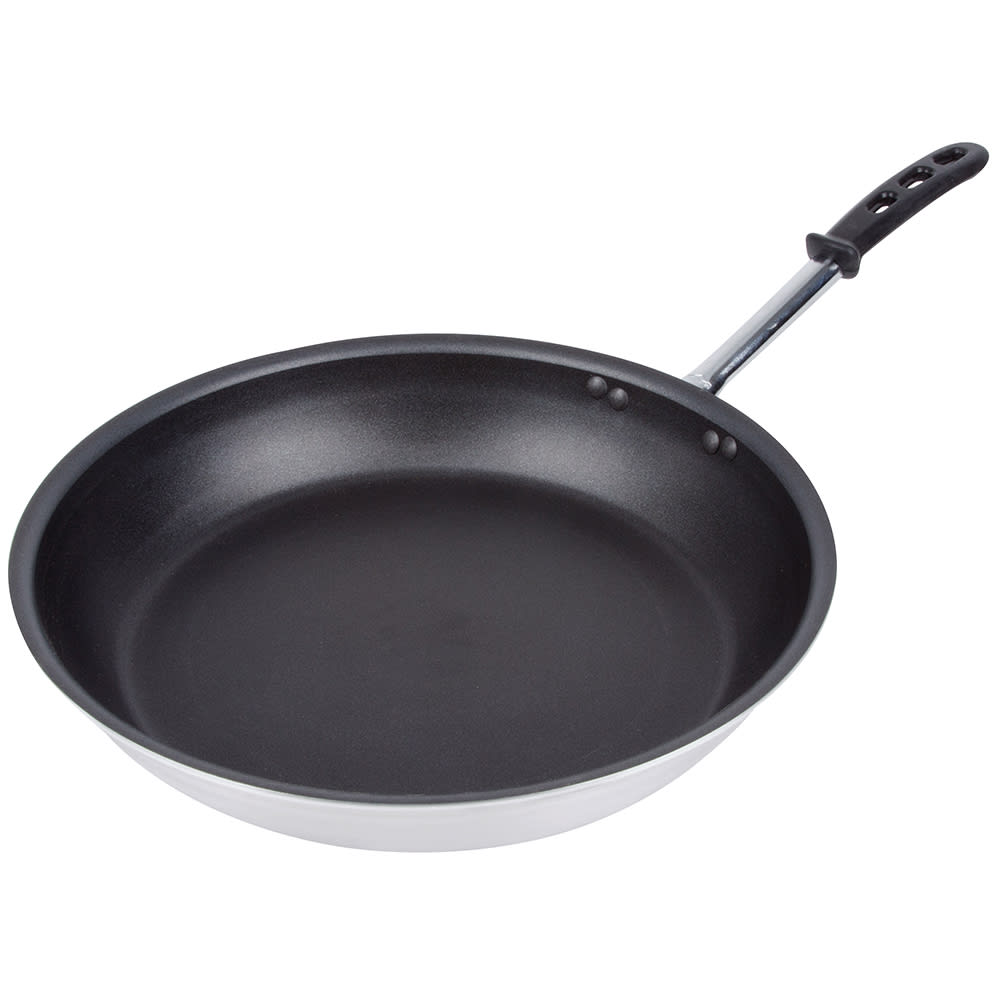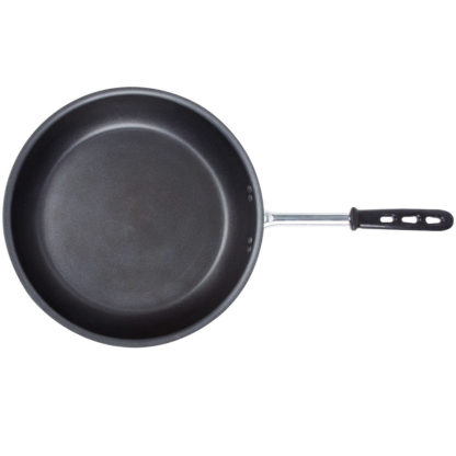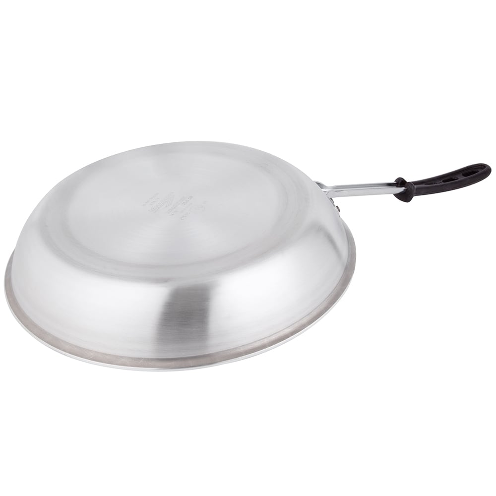 The Vollrath 67614 frying pan has a non-stick interior coating with three layers and a rust-resistant aluminum construction. The silicone handle stays cool to the touch, is connected to the pan with a rivet system, and has three vents that release heat. This pan is safe in temperatures as high as 450 degrees Fahrenheit.