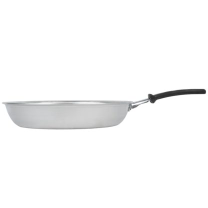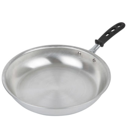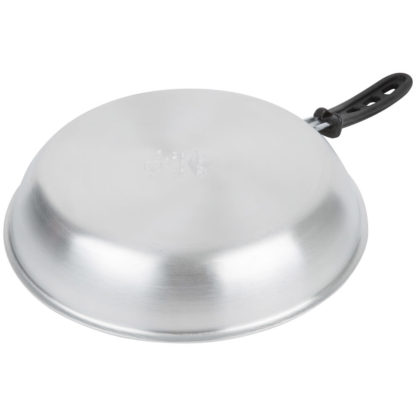 The Vollrath 67912 Wear-Ever frying pan has a natural finish on the aluminum body; it resists corrosion and heats and cools quickly. Rivets attach the handle to the pan, and the handle has three holes in it to quickly dry. The pan can be used in the oven and on the stovetop, withstanding heat as high as 450 degrees Fahrenheit.