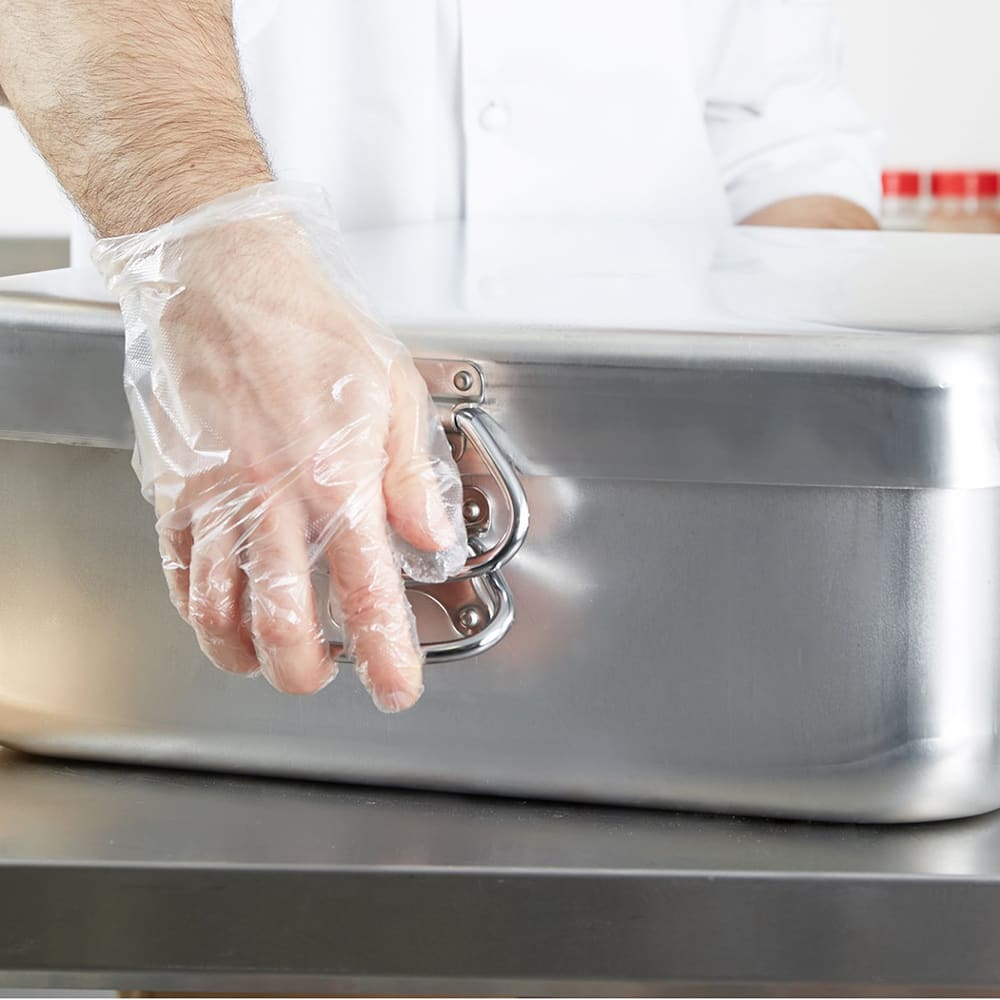 The Vollrath 68391 Wear-Ever roasting pan’s large, 42-quart capacity makes it a good choice for establishments that produce a high-volume of meats and vegetables. To move the pan from one area of the kitchen to another, users can grip the loop handles that are located on all sides. For resistance to damage from drops and impacts in a commercial environment, this pan is made of strong, 4-gauge aluminum.