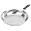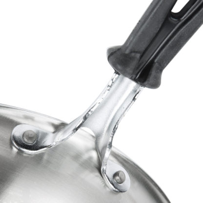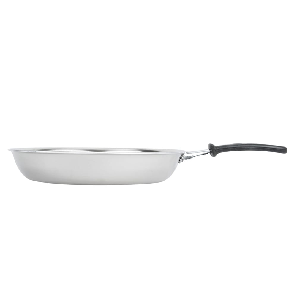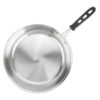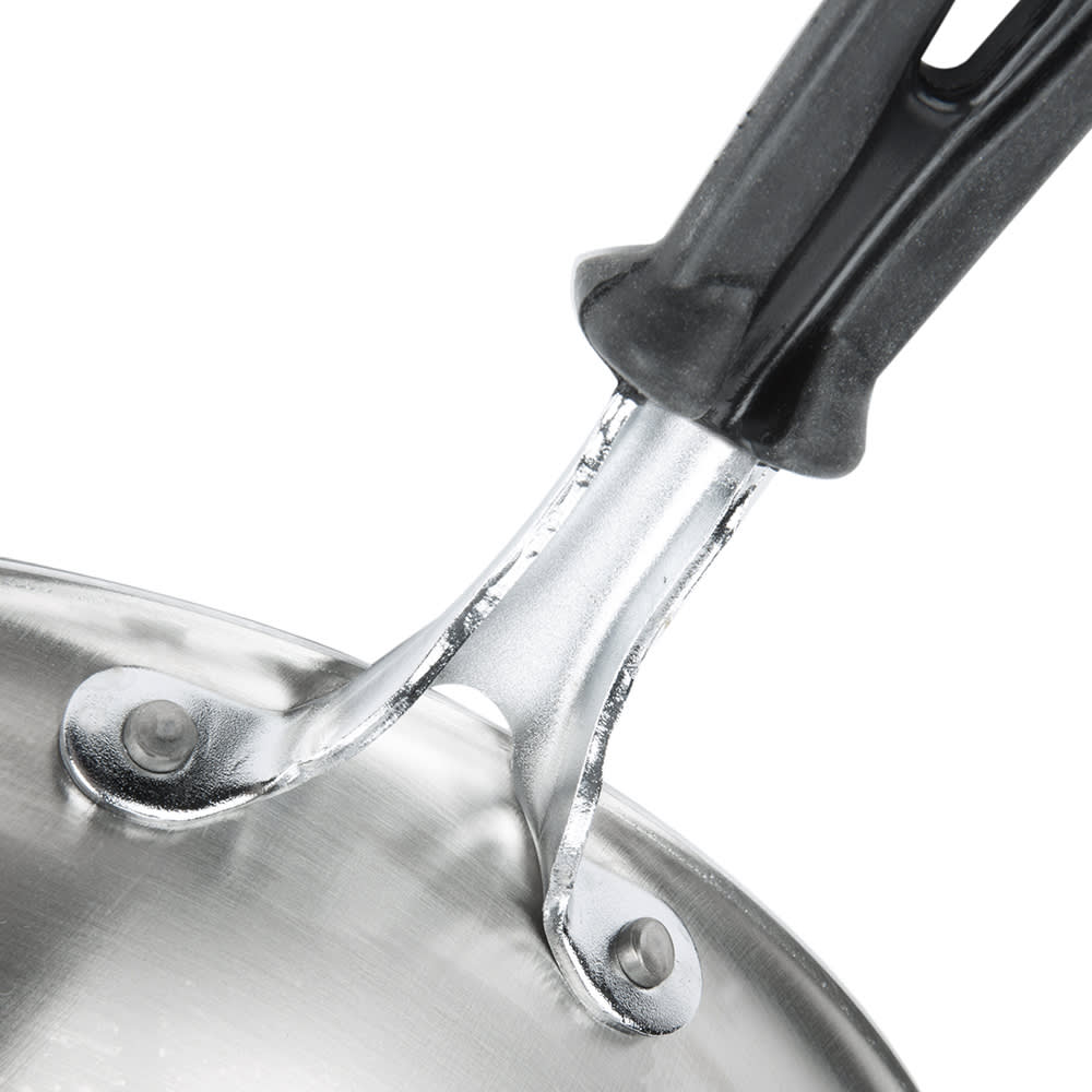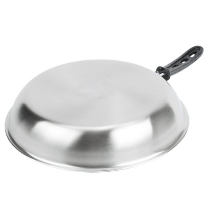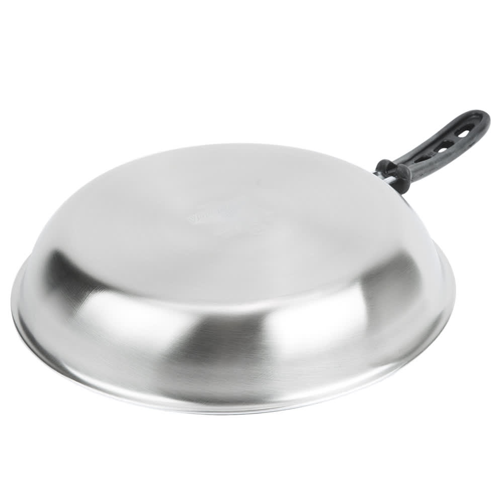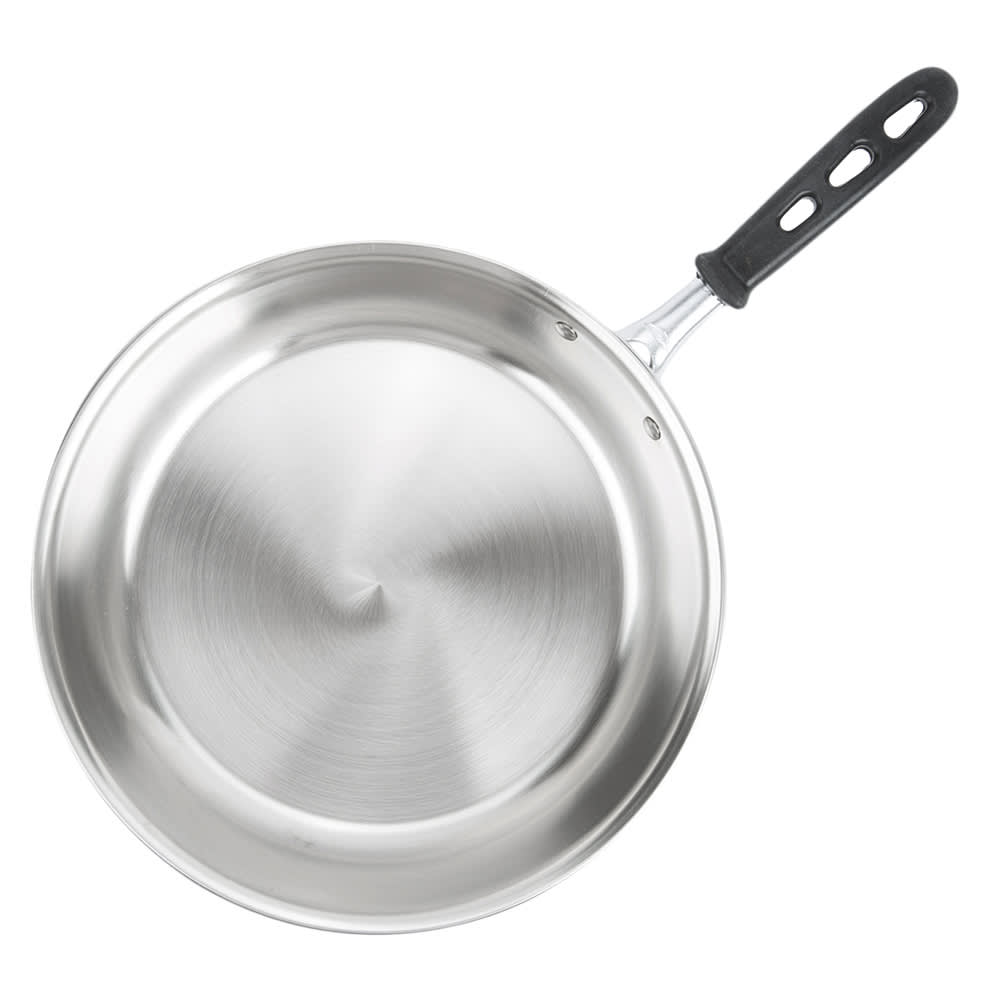 Three layers make up the Vollrath 69812 Tribute frying pan. An aluminum core ensures heat is evenly distributed, while the durable stainless steel interior and exterior are corrosion resistant. With a magnetic exterior, the pan can be used for induction cooking, ovens and ranges, while the handle sleeve remains cool and is secured with heavy-duty rivets.