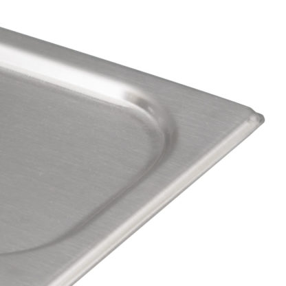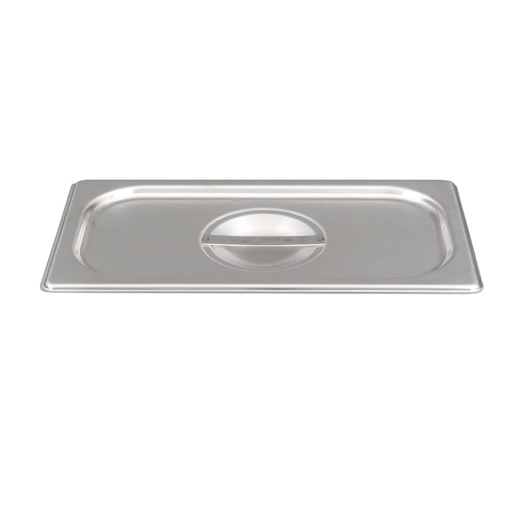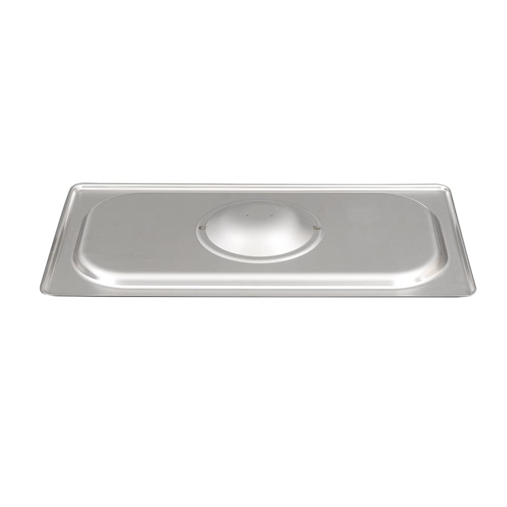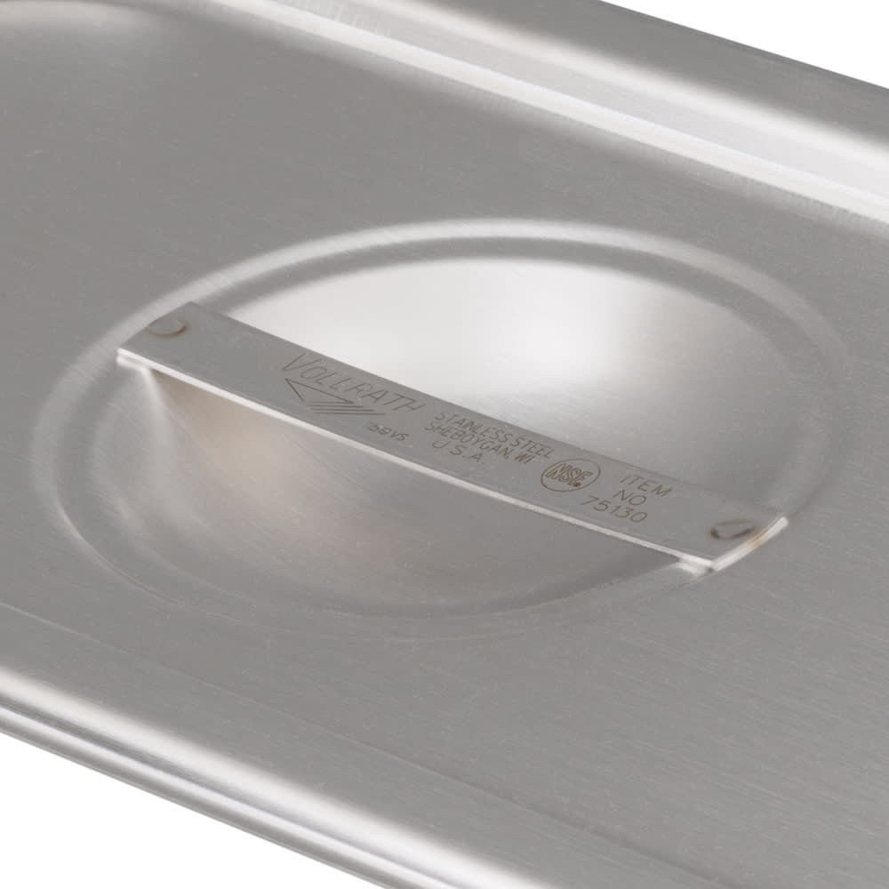 The Vollrath 75130 Super Pan V third-size steam pan cover is solid and does not have slots where contaminants can enter the pan. With the durable stainless steel construction, the lid is corrosion resistant, while reinforced edges provide additional durability.