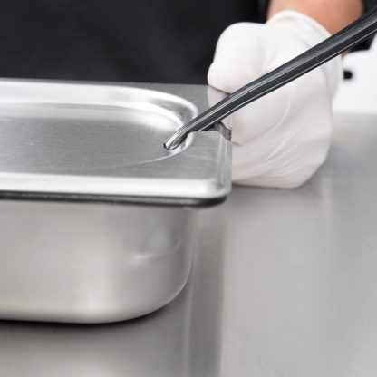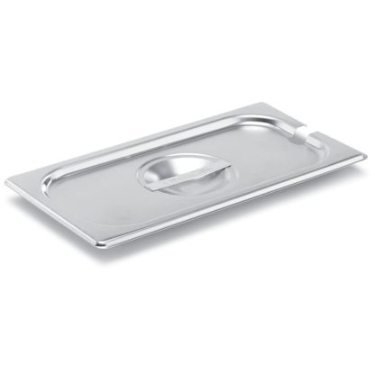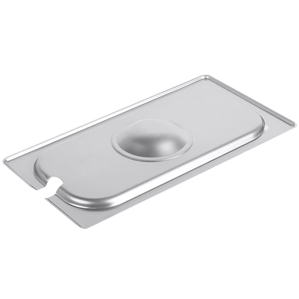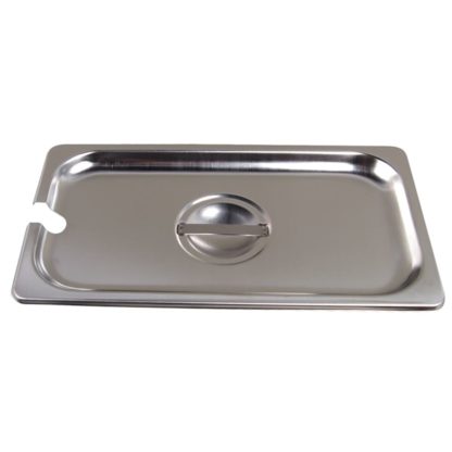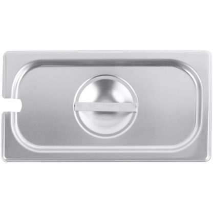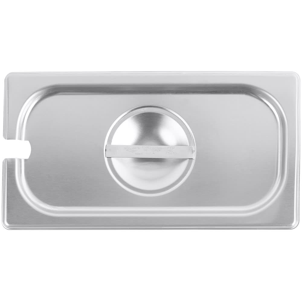 The Vollrath 75230 third-size steam pan cover is constructed of stainless steel to resist corrosion and simplify the cleaning process. Reinforced for durability, the edges withstand heavy use in commercial applications. Spoons and other utensils rest in the pan since the cover has a slot to hold them in place.