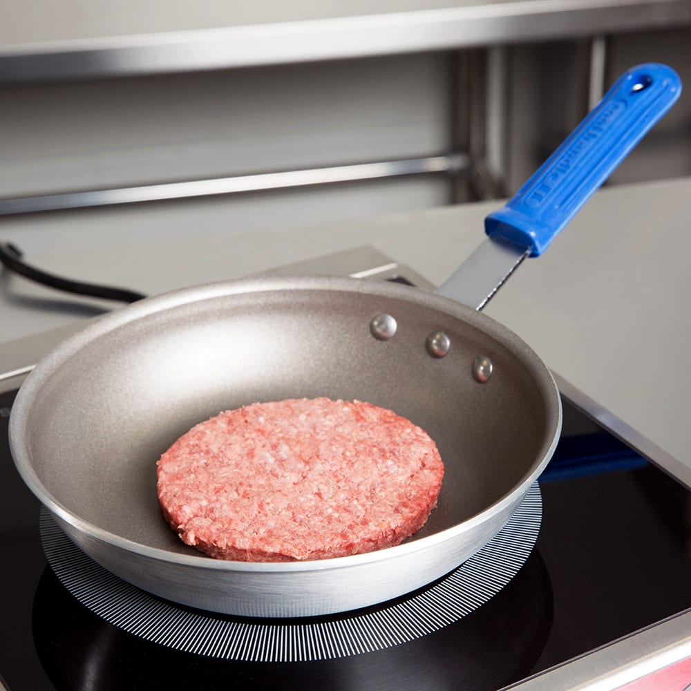 The Vollrath S4008 Wear-Ever frying pan is made of aluminum that resists corrosion and warping. A non-stick coating over the material simplifies cleanup and provides additional durability. To reduce the risk of burns, the handle sleeve stays cool to the touch. In the oven and on the stovetop, the handle is safe to 600 degrees Fahrenheit intermittently. Heavy-duty rivets permanently bond the handle to the pan.