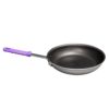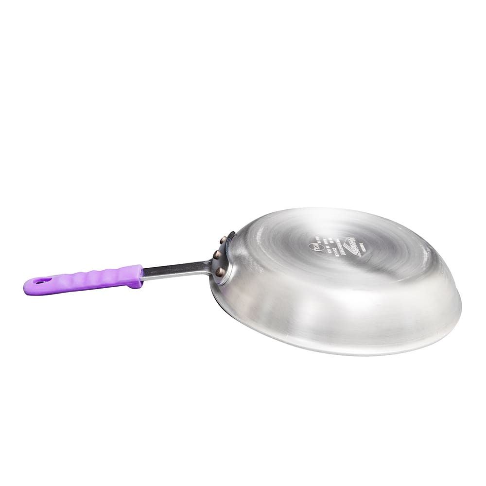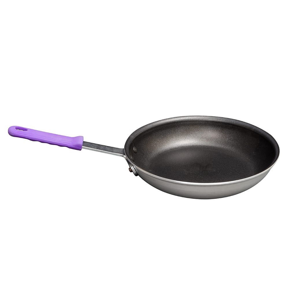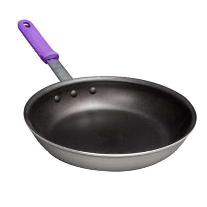 Wear-Ever Aluminum Fry Pan, 10″ (25.4 cm), with SteelCoat X3, featuring removable purple silicone insulated handle & innovative EverTite Riveting System, handle rated at 450° for stovetop or oven use, 7-5/8″ (20 cm) bottom diameter, 2″ (5.1cm) inside height, 8 ga., NSF, Made in USA