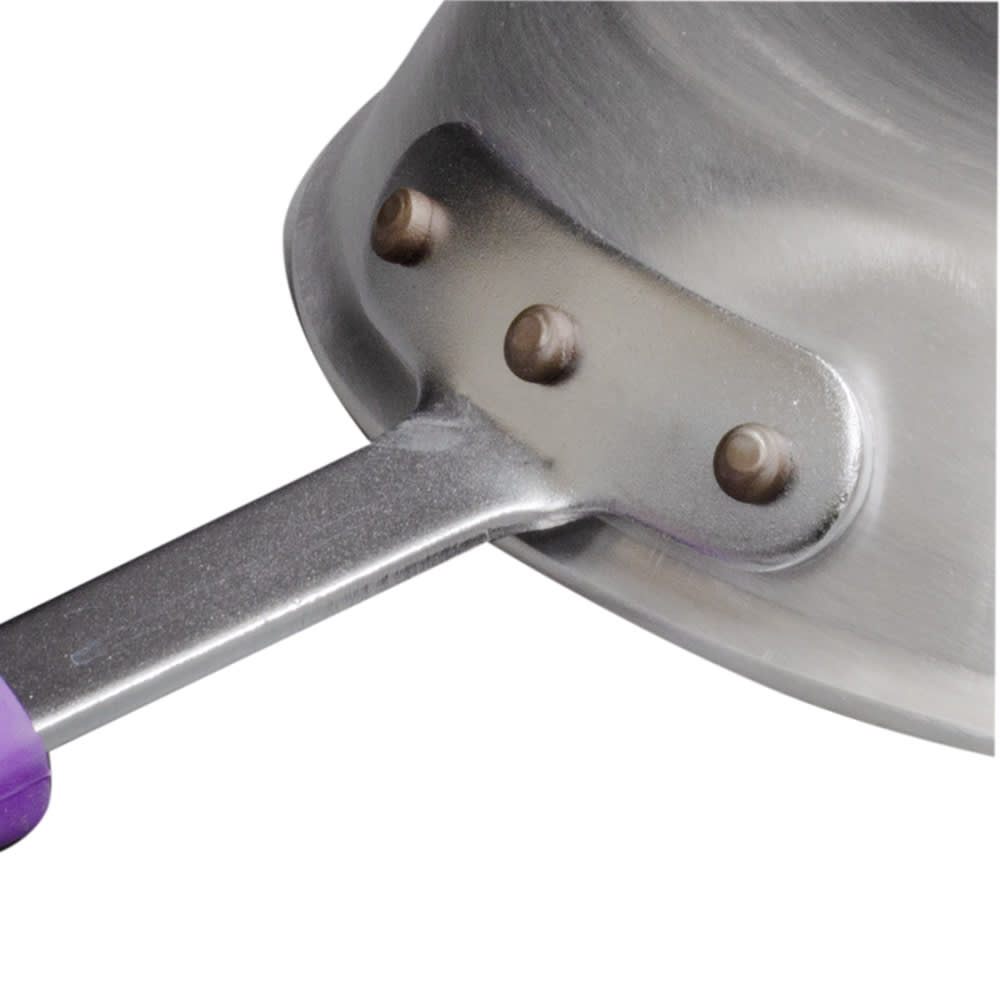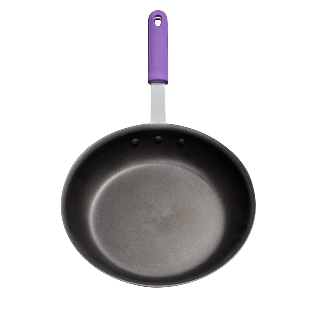 The Vollrath T401080 Wear-Ever frying pan can withstand heavy-duty operations and is made of scratch-resistant aluminum alloy. Its insulated Cool Handle is made of purple silicone, which can endure temperatures as hot as 450 degrees Fahrenheit and satisfies non-allergen cooking needs. The Vollrath T401080 frying pan has EverTite rivets connecting the handle to the pan. Its nonstick coating is triple-layered Steelcoat x3 to ensure food comes off the surface.
