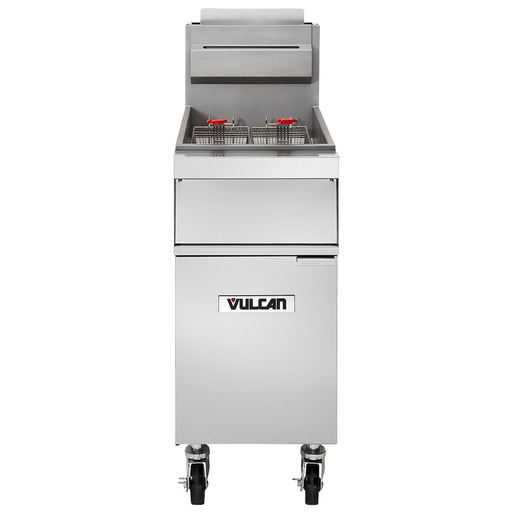 The Vulcan 1GR35M fryer is ideal for medium-volume applications, with a fry tank oil capacity of 35 to 40 pounds. There is a V-shaped cold zone where sediment can fall beneath the cooking area so it will not carbonize and ruin the oil, which can extend oil life and ensure it does not give foods a burnt flavor. A millivolt thermostat control is used to adjust the temperature on this unit, and temperatures range from 200 to 400 degrees Fahrenheit. A tank brush, clean-out rod, and crumb scoop are all included for cleaning out the 14-inch-by-14-inch fry tank.