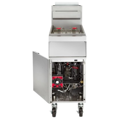 Fryer, natural gas or liquid propane, 15-1/2″ W, free-standing, 35-40 lb. capacity, millivolt thermostat controls, twin baskets, stainless steel cabinet and fry tank, 6″ adjustable casters (2 swivel locking & 2 non-locking), 90,000 BTU, CSA Star, CSA FLame, NSF