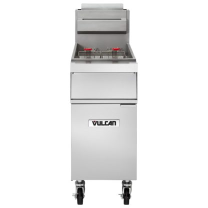 The Vulcan 1GR65M gas fryer is mobile due to the four 6-inch, adjustable casters and can be locked into place since two casters have locks. The temperature can be adjusted on this fryer with the millivolt thermostat control that sits behind the door. The stainless steel fry tank is durable for long-term use and holds a frying capacity of 65 to 70 pounds. The cabinet is also made of stainless steel to resist damage, like scratching or dents. There are twin fry baskets so you can fry more than one thing at a time, and each has a plastic coated handle to prevent injuries. Five heat exchanger tubes are positioned to make cleaning simple. A tank brush, crumb scoop, and clean-out rod are included to make cleaning the tank simpler. The Vulcan 1GR65M gas fryer has a combination gas shut-off valve and pilot safety system.