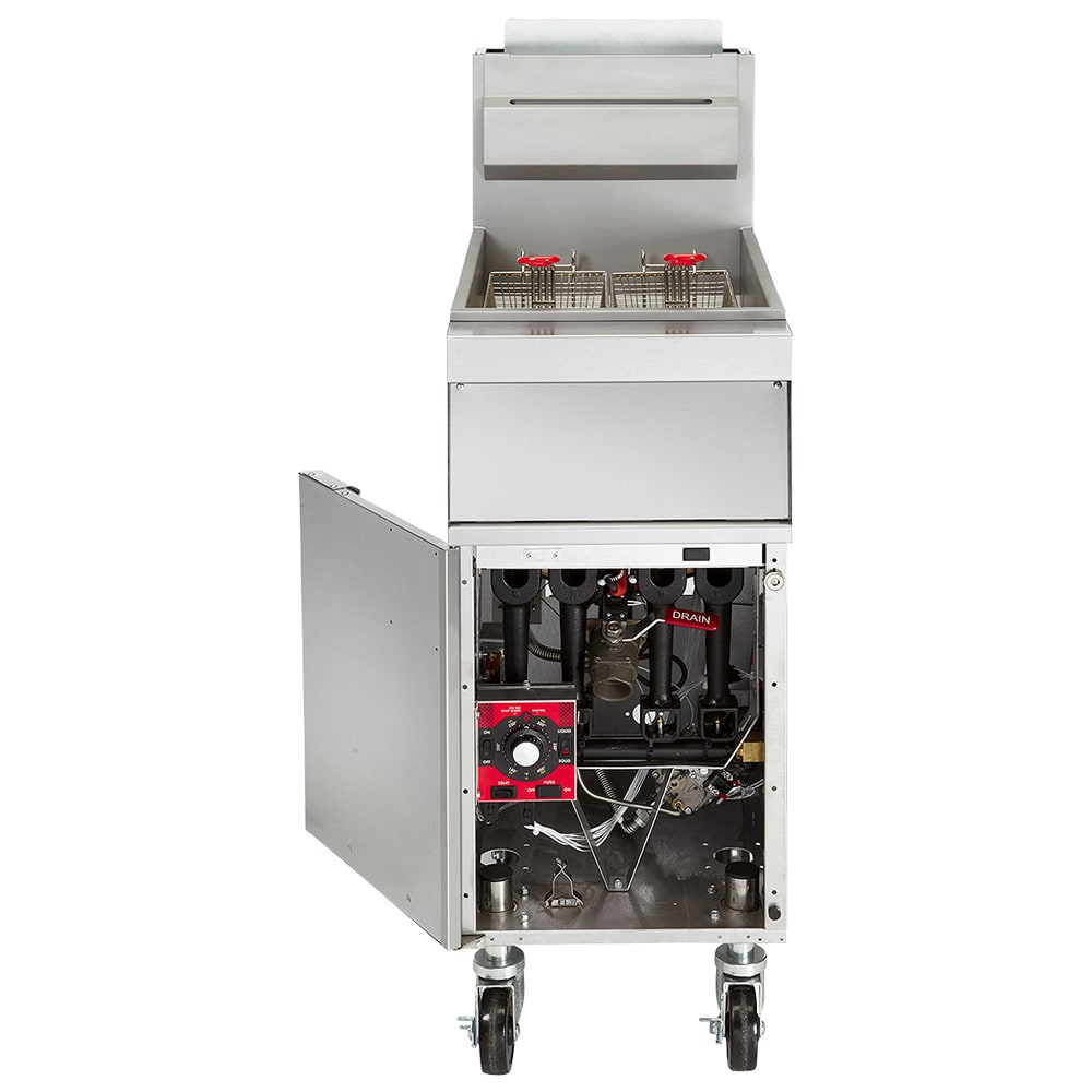 Fryer, natural gas or liquid propane, 21″ W, free-standing, 65-70 lb. capacity, millivolt thermostat controls, twin baskets, stainless steel cabinet and fry tank, adjustable casters (2 swivel locking & 2 non-locking), 150,000 BTU, CSA Star, CSA Flame, NSF