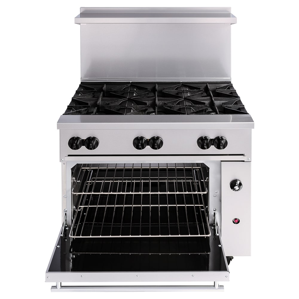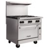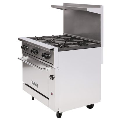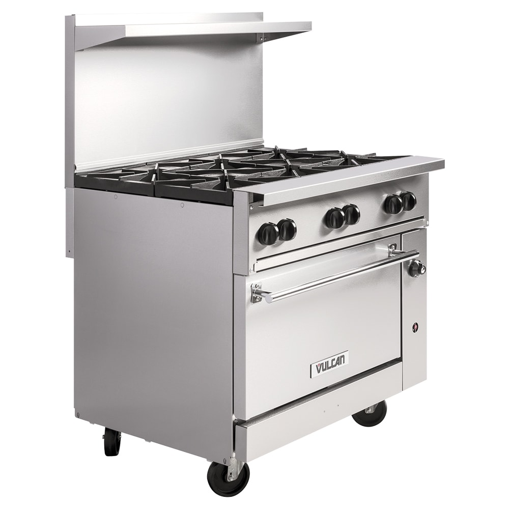 The Vulcan 36C-6B natural gas or liquid propane range uses a flash tube pilot system with natural gas or liquid propane to heat. It comes with six lift-off grates that sit over burners, which each have their own stay-cool knob. Grates in the back are larger than the front ones to accommodate stock pots. Aeration bowls below the cast iron grates direct heat towards pots and pans. Its crumb tray collects runoff from food and is removable for simple cleanup.