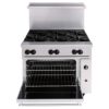 The base is a single convection oven with two adjustable shelves and a temperature range of 250 to 500 degrees Fahrenheit. Full-size sheet pans can be placed in the oven front to back or side to side. The frame is completely MIG welded for durability. Since t is constructed of heavy-duty stainless steel, the unit is easy to clean. The Vulcan 36C-6B natural gas or liquid propane range has adjustable legs for level installation on uneven floors.