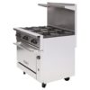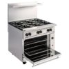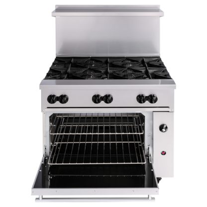Endurance Restaurant Range, natural gas or liquid propane, 36″, (6) 30,000 BTU burners, lift-off burner heads, convection oven, stainless steel front, sides, backriser & lift-off high shelf, fully MIG welded chassis, 6″ adjustable legs, 215,000 BTU, CSA, NSF