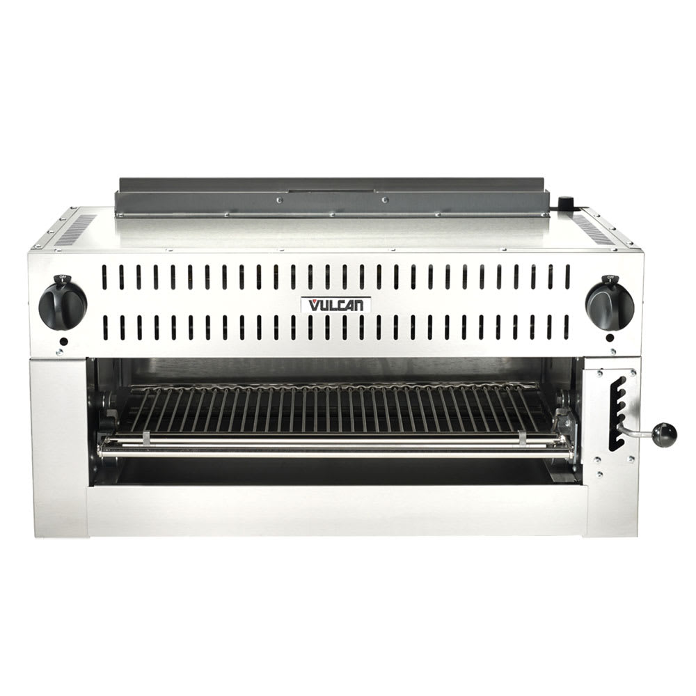 The Vulcan-Hart 36RB 36-inch natural gas or liquid propane salamander broiler features six 8,300 BTU-cast iron burners with stainless steel radiants, operating at total input of 50,000 BTUs per hour. This model features dual heat controls for zone cooking that operate from 250 to 800 degrees. It also has a cool-to-the-touch knob that gives the correct positioning of its broiler carriage. This heavy duty salamander broiler also has a heavy duty chrome-plated broiling grid to hold your products together.