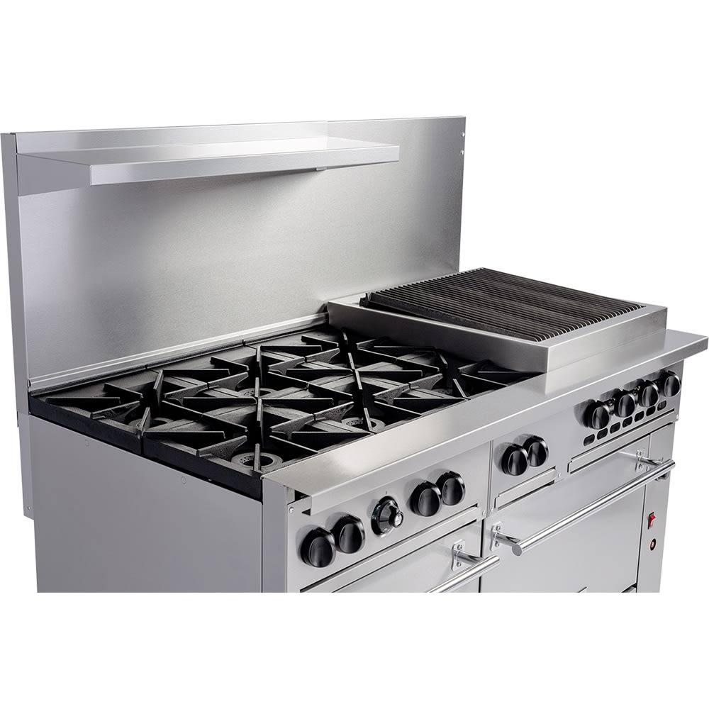 Endurance Restaurant Range, natural gas or liquid propane, 60″, (6) 30,000 BTU burners with lift-off burner heads, (1) 24″ manual griddle/broiler, 7/8″ thick, 4″ wide front grease trough, (1) standard oven base, (1) convection oven, stainless steel front, sides, backriser & high shelf, fully MIG welded frame, 6″ adjustable legs, 268,000 BTU, CSA, NSF