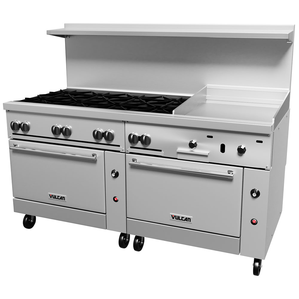 The Vulcan 72SC-8B24G gas range measures 72 inches wide by 41 inches deep by 58 inches tall. It is powered by natural gas or liquid propane and has eight 30,000 BTU burners. Since the burners have lift-off heads, the components are easy to access for cleaning and servicing. The burner knobs stay cool to prevent burns.