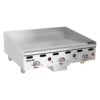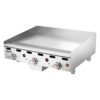 Heavy Duty Griddle, countertop, gas, 36″ W x 30″ D cooking surface, 1″ thick polished steel griddle plate, embedded mechanical snap action thermostat every 12″, millivolt pilot safety, electric spark or manual ignition, front manifold gas shut-off valve, low profile, stainless steel front, sides, front grease trough, 4″ back & tapered side splashes, 4″ adjustable legs, 81,000 BTU, CSA, NSF