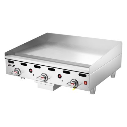 Made for heavy-duty use, the Vulcan 936RX-30 36-inch gas griddle is a great choice for high-volume kitchens. The countertop design enables flexibility in placement, and this griddle is equipped with three u-shaped burners that create separate cook zones. The burners can be lit with either the electric igniter or manually, while a pilot safety valve blocks gas flow in the event the pilot is extinguished. For additional safety, the gas inlet can be manually shut-off.