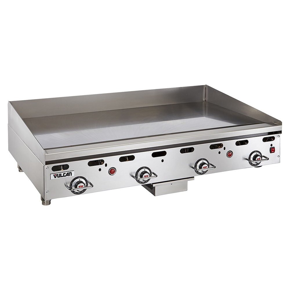 Heavy Duty Griddle, countertop, gas, 48″ W x 30″ D cooking surface, 1″ thick polished steel griddle plate, embedded mechanical snap action thermostat every 12″, millivolt pilot safety, electric spark or manual ignition, front manifold gas shut-off valve, low profile, stainless steel front, sides, front grease trough, 4″ back & tapered side splashes, 4″ adjustable legs, 108,000 BTU, CSA, NSF