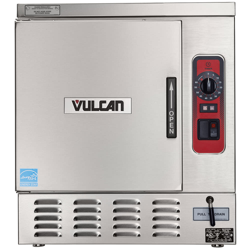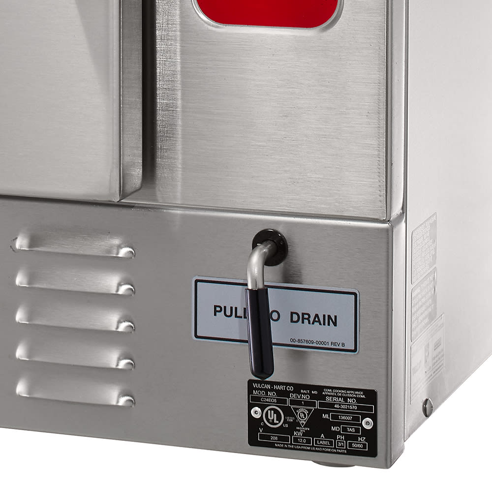 The Vulcan C24EO5AF countertop convection steamer prepares 5 food pans full of meats, vegetables, or other products at once, using both steam and convection cooking. It connects to an existing water line and fills its reservoir automatically. Because this unit does not use a boiler, it does not require filtration, treatment, or de-liming, and it is easier to clean and service than a steamer that requires a boiler. Servicing the steamer is straightforward due to side panels that can be removed to access interior parts.