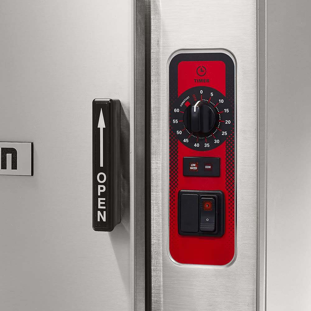 The Vulcan C24EO5AF convection steamer has manual controls and a 60-minute timer knob that buzzes when the cycle is complete. When staff need to check on product, the door can be opened even while the unit is steaming, and its guard protects the gasket from damage as pans are loaded and removed. The wire pan racks and steam panel can be removed and cleaned in the dishwasher.