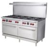 The Vulcan SX60-10B range has 10 burners on top with flash tube pilots that enable two burners to be lit at one time. Lift-off heads simplify cleaning, while a rugged cast top grate and aeration bowls focus heat toward the food. Constructed of stainless steel, the unit holds up for commercial usage. It has a fully welded crumb tray that prevents leaks and adds durability, and adjustable legs enable installation on uneven surfaces.