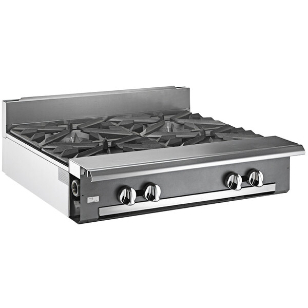 V Series Heavy Duty Range, natural gas or liquid propane, 36″, modular, (4) 35,000 BTU open burners, cast iron grates, stainless steel front, front top ledge, sides, burner box & stub back, 4″ flanged feet, 140,000 BTU, CSA, NSF