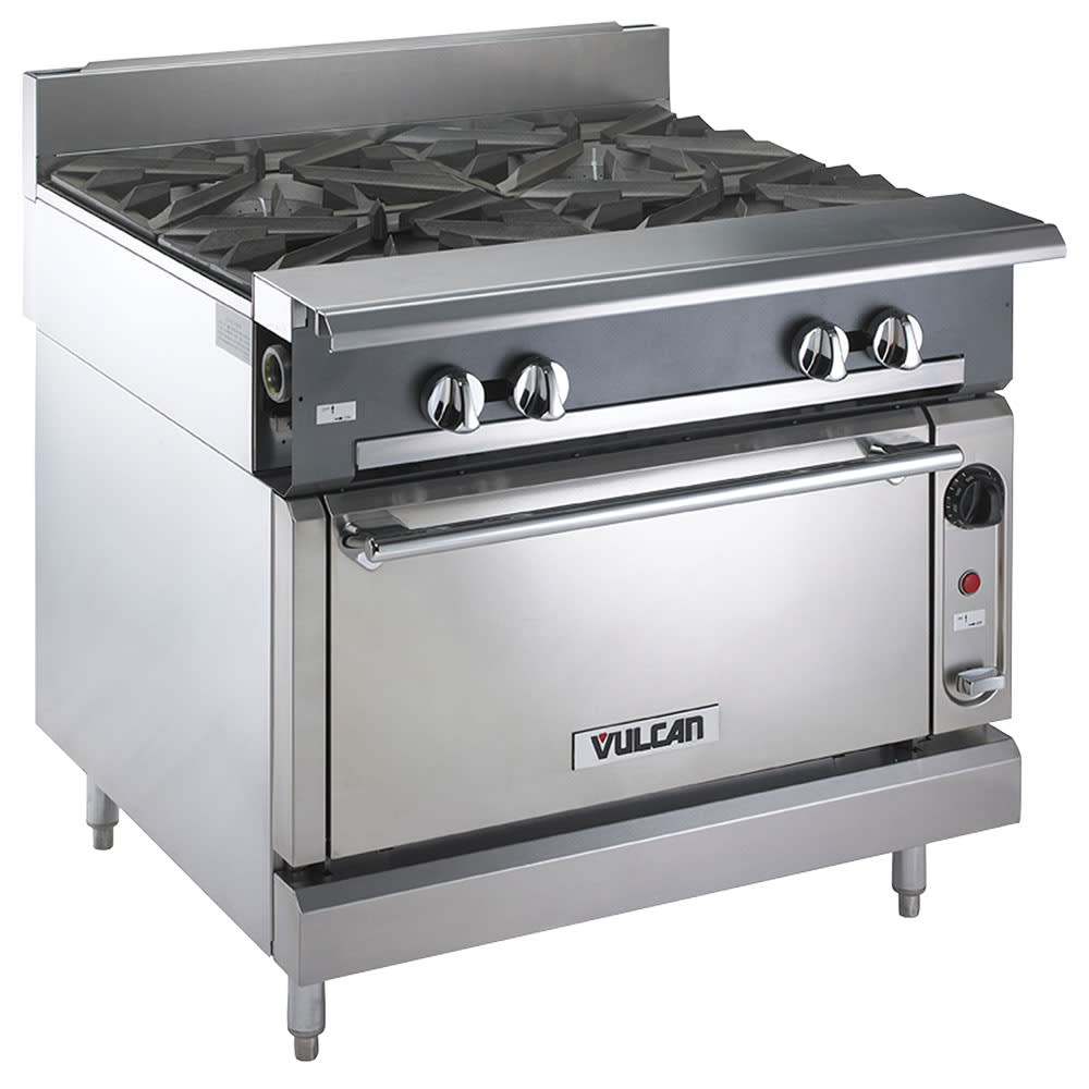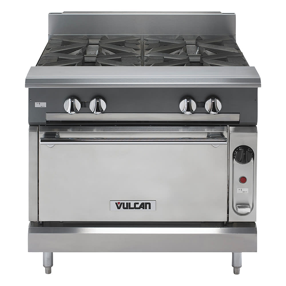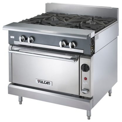 V Series Heavy Duty Range, gas, 36″, (4) 35,000 BTU open burners, cast iron grates, convection oven, stainless steel front, front top ledge, sides, base, burner box & stub back, 172,000 BTU, 6″ adjustable legs, CSA, NSF