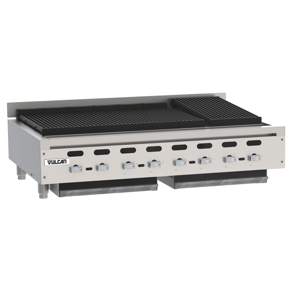 The Vulcan VACB47 radiant charbroiler has eight 17,000 BTU burners powered by natural gas or liquid propane. Since each burner has an infinite heat control valve, adjustments to the unit’s temperature can be made easily. The front panel has valve adjustment marks to make set up simple, while the burner dividers reduce heat transfer to improve multi-zone cooking. With cast iron radiants, the charbroiler is perfect for cooking steaks, burgers, shrimp, and more.