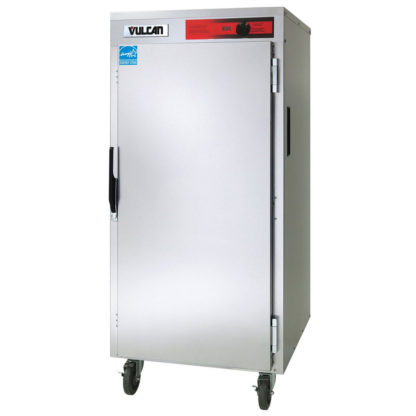 The Vulcan VBP13 full-size heated holding cabinet can hold food at temperatures of up to 190 degrees Fahrenheit. The blower motor evenly and gently distributes heat throughout the cabinet. Since the cabinet has recessed side-mounted handles and 5-inch heavy duty casters, transporting is much easier. The interior and exterior stainless steel construction makes the cabinet durable and resistant to scratching and denting. To keep heat inside the cabinet, insulation is 11/2 inches thick in the side walls and 2 inches thick on the top. The steel frame adds strength and durability to the cabinet. Doors are field-reversible for your convenience, and the magnetic door latch keeps the door shut during transportation. The Vulcan VBP13 full-size heated holding cabinet has 10 pairs of tray slides and holds 18-inch by 26-inch pans and 12-inch by 20-inch pans.