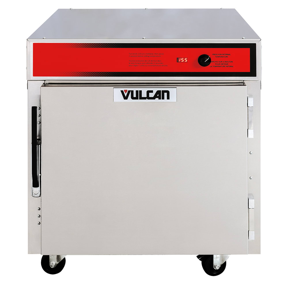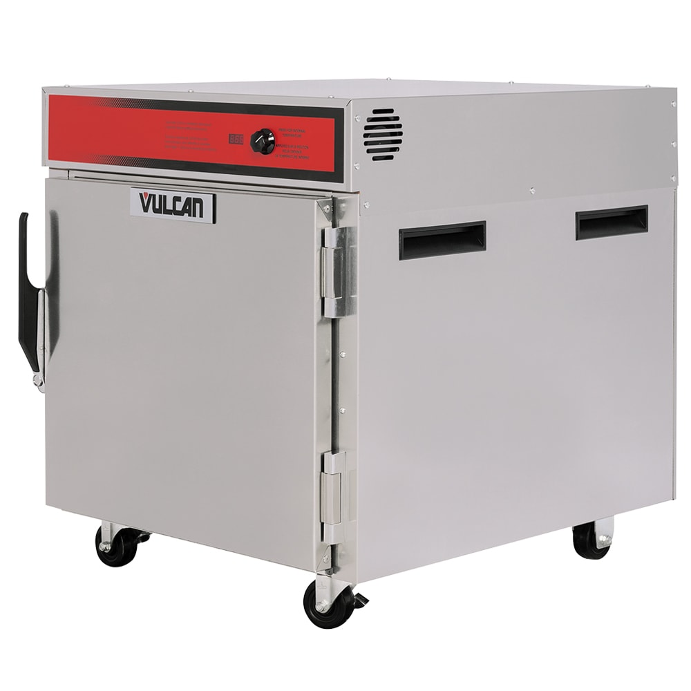 The Vulcan VBP5 heated holding cabinet is constructed of stainless steel to resist corrosion and hold up to high-volume use. Its steel frame strengthens the cabinet’s overall structure, while insulated sides and top increase efficiency by containing warm air. Heat is spread gently and consistently by the blower motor, and five universal slides accommodate (10) 12-inch-by-20-inch-21/2-inch pans or (5) 18-inch-by-26-inch sheet pans. A recessed door handle assists in opening and closing the door, which shuts soundly because of its magnetic latch. The Vulcan VBP5 heated holding cabinet holds products at temperatures at a maximum of 190 degrees Fahrenheit. Electronic controls adjust the temperature, while two rigid and two swivel casters aid in transportation.
