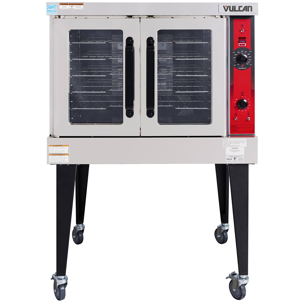 Convection Oven, natural gas or liquid propane, single-deck, standard depth, solid state controls, electronic spark igniter, 60 minute timer, (5) nickel plated racks, 25-3/4″ high legs, stainless steel front, top and sides, stainless steel door with window, 50,000 BTU, NSF, CSA Star, CSA Flame, ENERGY STAR