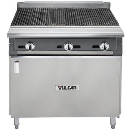 V Series Heavy Duty Range, gas, 36″, charbroiler, cast iron grates & radiants, cabinet base, stainless steel front, front top ledge, side, base, burner box & stub back, 6″ adjustable legs, 99,000 BTU, CSA, NSF